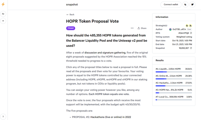 스위스의 직접민주주의에 기반한 HOPR 시스템은 토큰 소유권에 대해 투표권을 부여하는 동시에 모두의 의견을 구할 수 있는 사이에 균형을 찾기 위해 설계되었습니다.