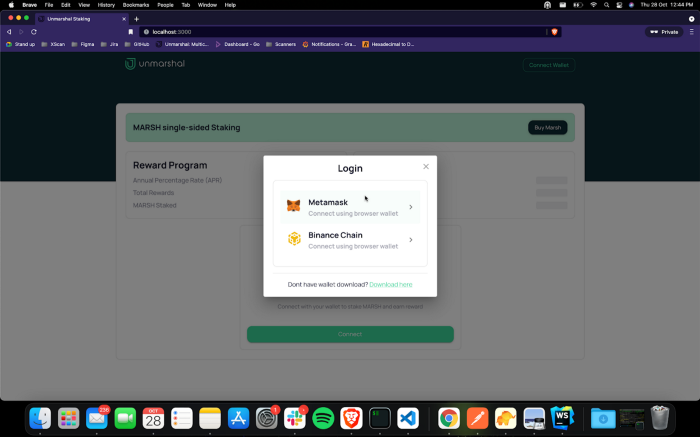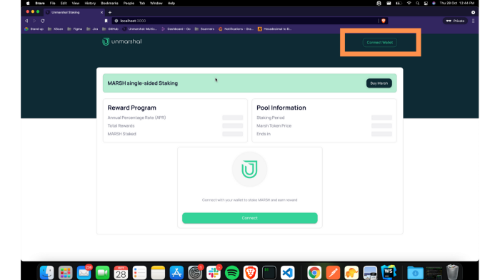 stake.unmarshal.io를 방문해 화면의 우측 상단 ‘Connect Wallet’버튼으로 Metamask/바이낸스 지갑을 연결합니다.