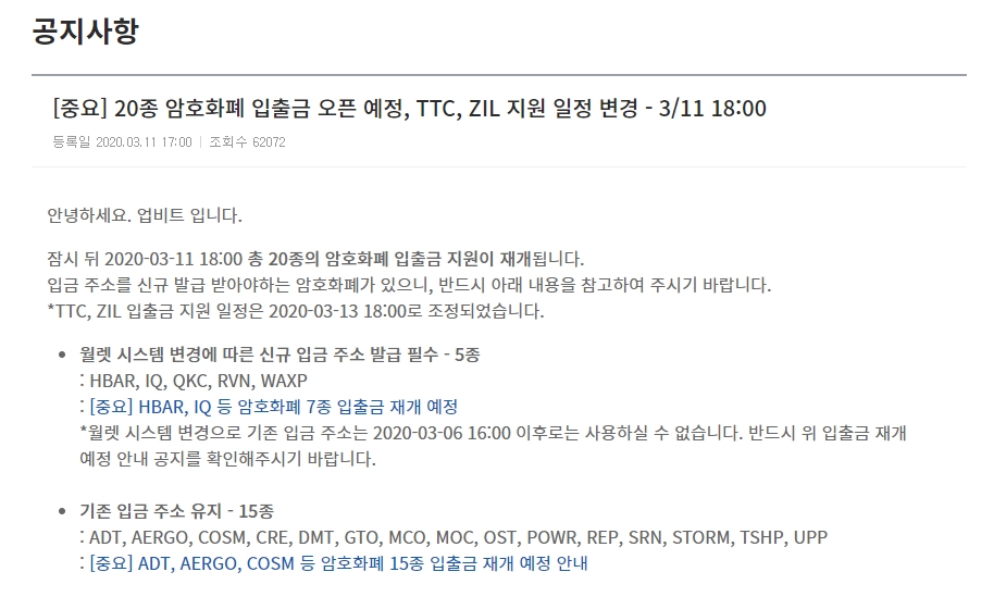 업비트가 20종 암호화폐의 입출금을 정상화 하였다.