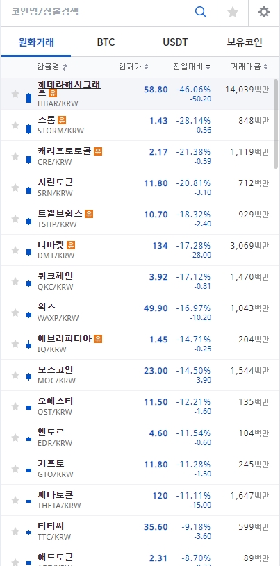 업비트 프리미엄이 형성되어 있던 코인들이 글로벌 시세에 맞게 하락을 면치 못하였다.