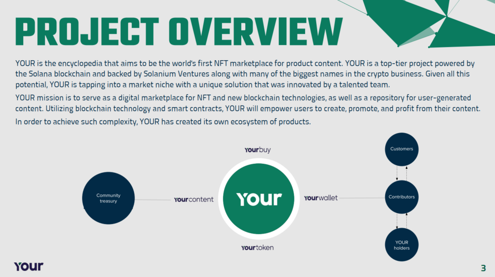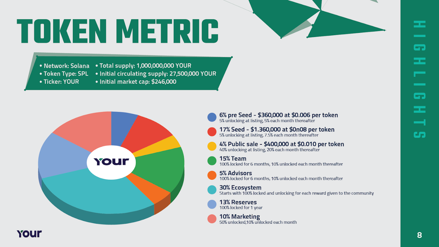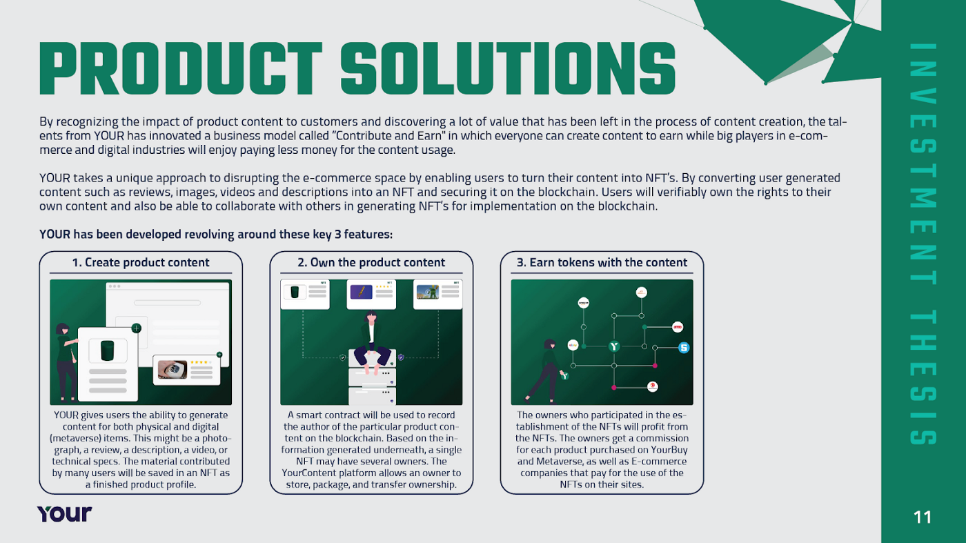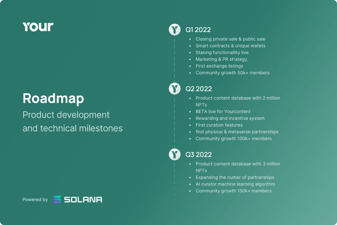 Your의 개발에는 20개월이 걸렸으며 결과적으로 완전한 기능을 갖춘 마켓플레이스 플랫폼이 생겼습니다. Your는 제품 NFT 및 전자 상거래의 미래를 계속 구축할 것입니다. Your는 보유자가 이익을 위해 스테이킹할 수 있는 YOURStaking의 첫 번째 기능을 출시할 것입니다.