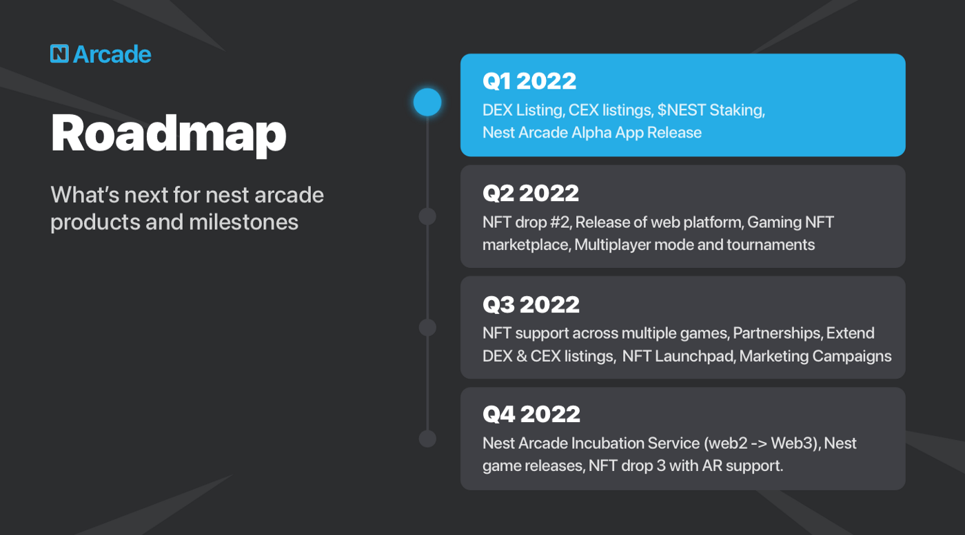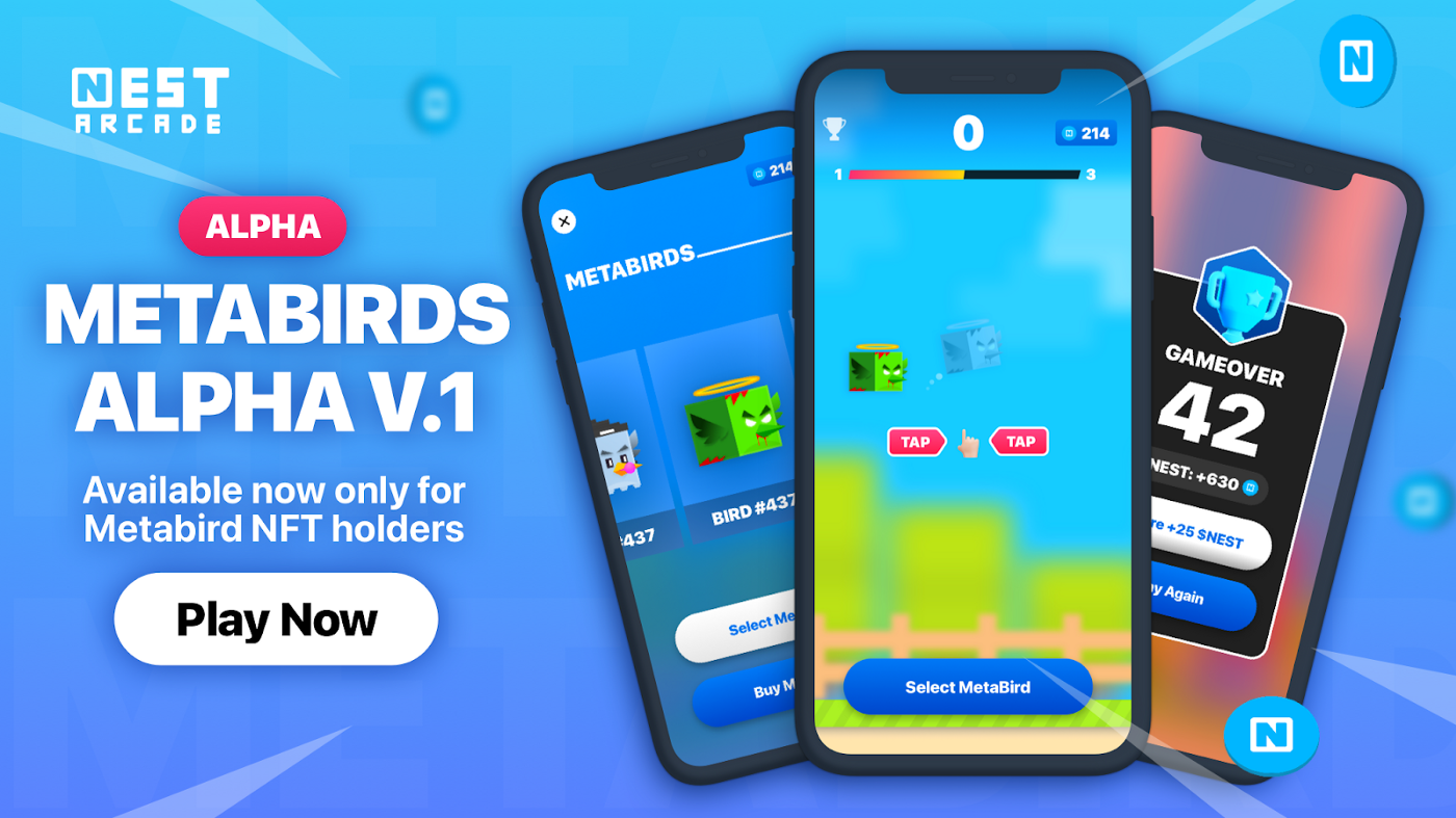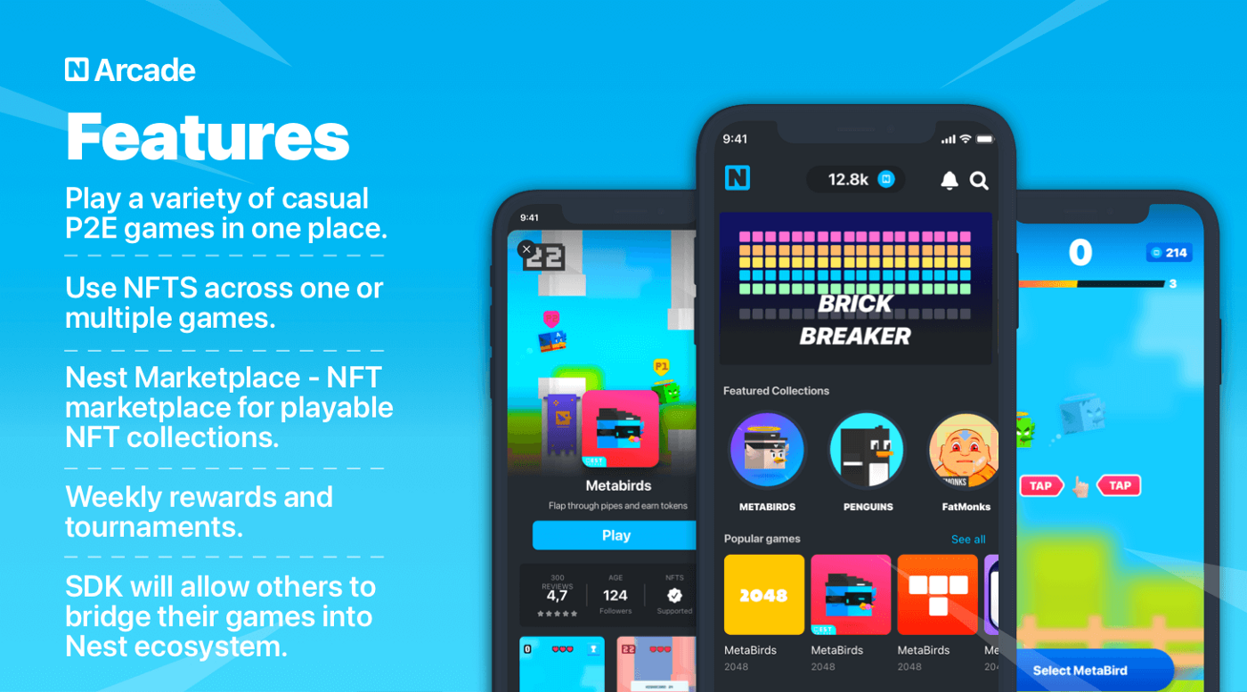 Nest는 블록체인 최초의 ‘P2E’ 아케이드 애플리케이션이 될 것입니다. Nest의 목적은 넷플릭스와 같이 간단한 앱을 통해 블록체인의 대량 채택을 가속화하는 동시에 이를 미니-중간 스케일의 게임에 한정하는 것입니다. 플레이어들은 인게임 캐릭터를 NFT를 사용해 소유할 수 있고, 다양한 P2E 게임에서 활용할 수 있게 됩니다.