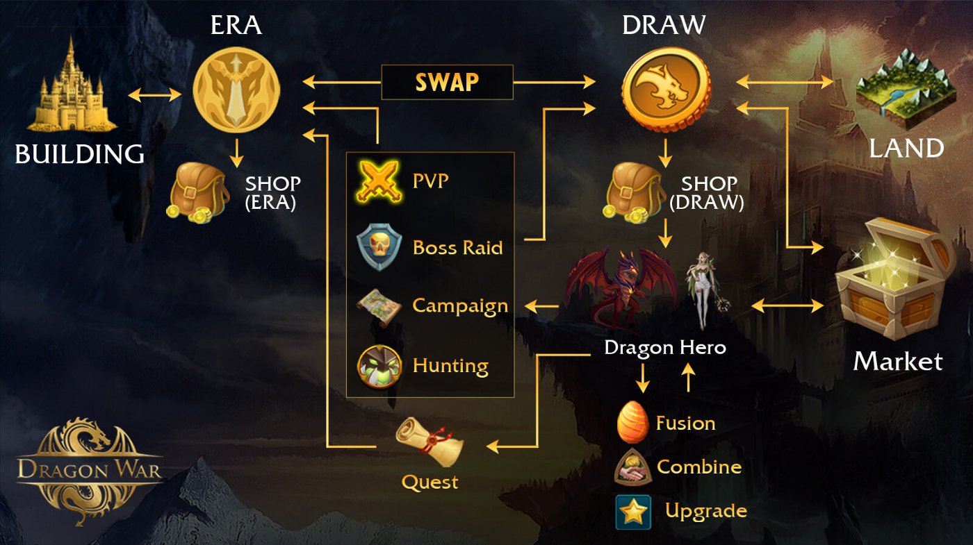 Dragon War는 두 가지의 토큰 모델을 운영합니다. 첫 번째는 메인 토큰인 DRAW로, 다음과 같이 활용됩니다: