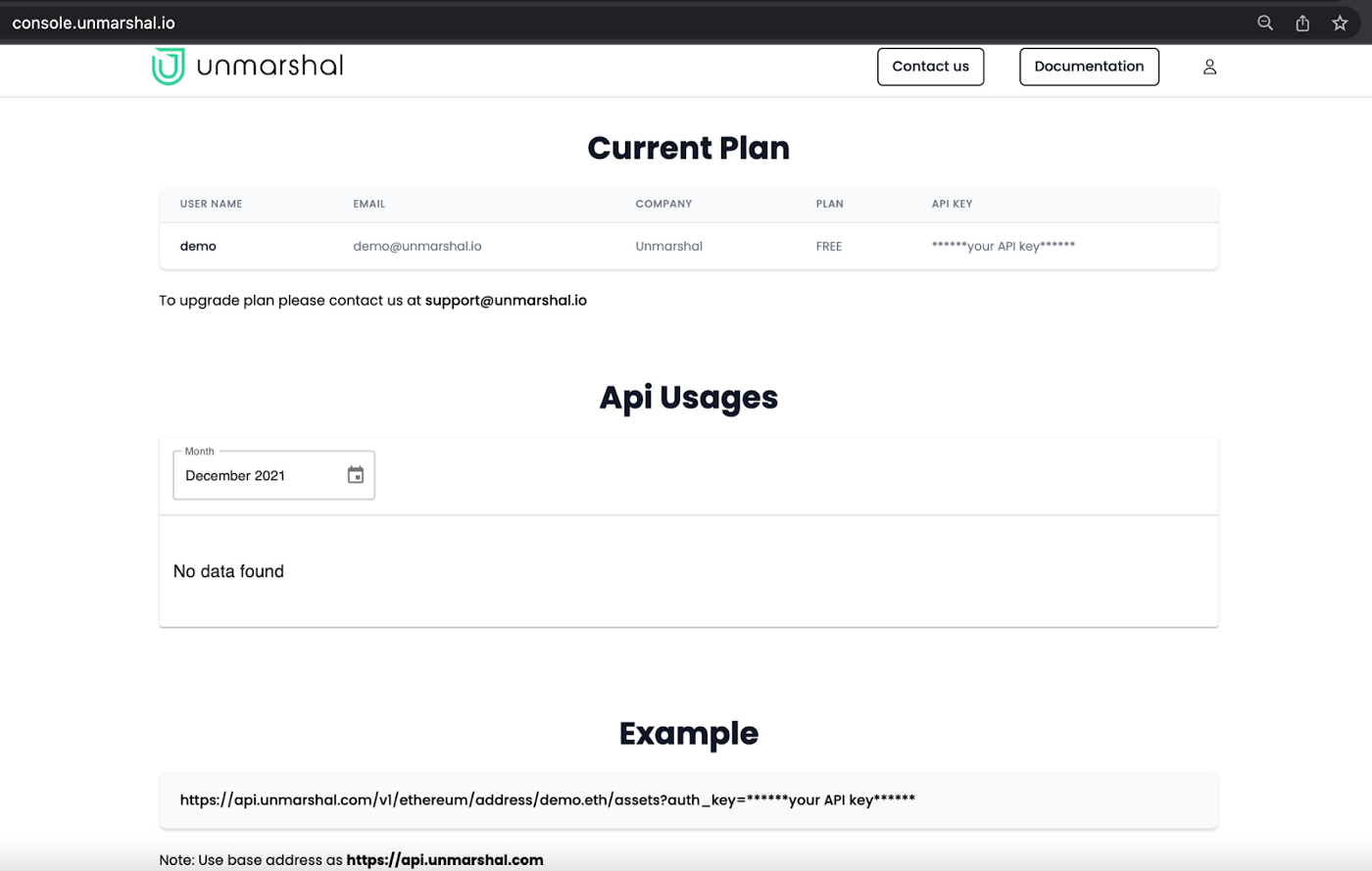 스텝 3: 프로젝트는 API 엔드포인트 테스트를 무료로 이용할 수 있기 때문에 사용자들은 support@unmarshal.io 로 연락해 플랜을 업그레이드해야 합니다. 이 프로세스는 곧 자동화되며 당사가 크립토 지불 게이트웨이를 통합하면 사용자들은 이를 단 한 번의 클릭으로 업그레이드할 수 있습니다.