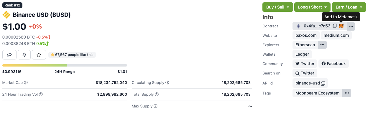 - CoinGecko로 이동해 BUSD 페이지에서 MetaMask 아이콘을 클릭해 지갑에 자동으로 추가합니다.