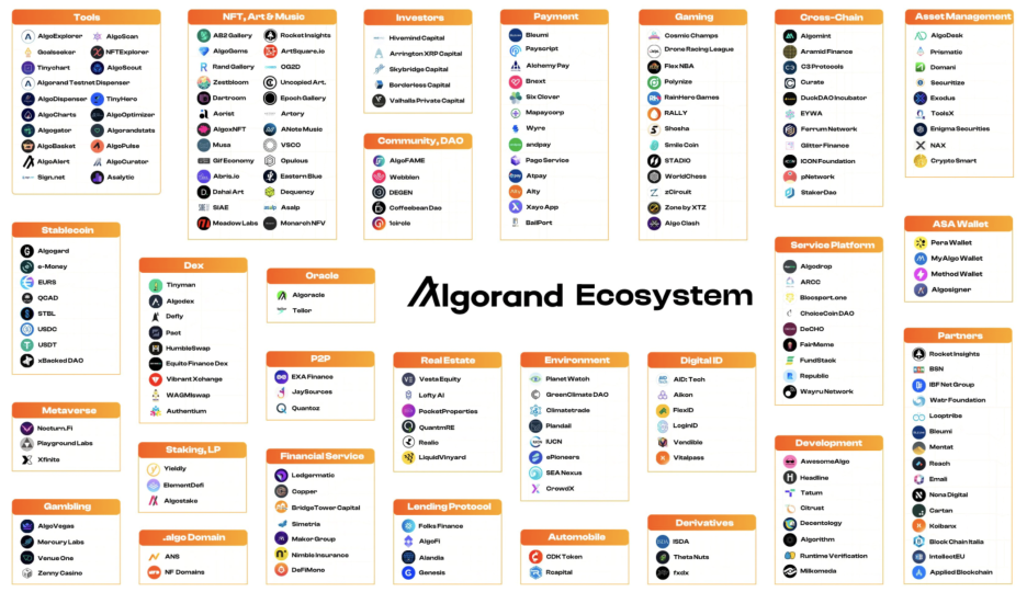 2년 간의 개발 끝에 알고랜드 생태계는 DEX, 대출, 크로스체인, 지갑, NFT 거래 등과 같은 27개의 하위 트랙을 포함하여 점점 개선되었습니다. 각 트랙의 프로젝트는 다음 차트에 나와 있습니다.