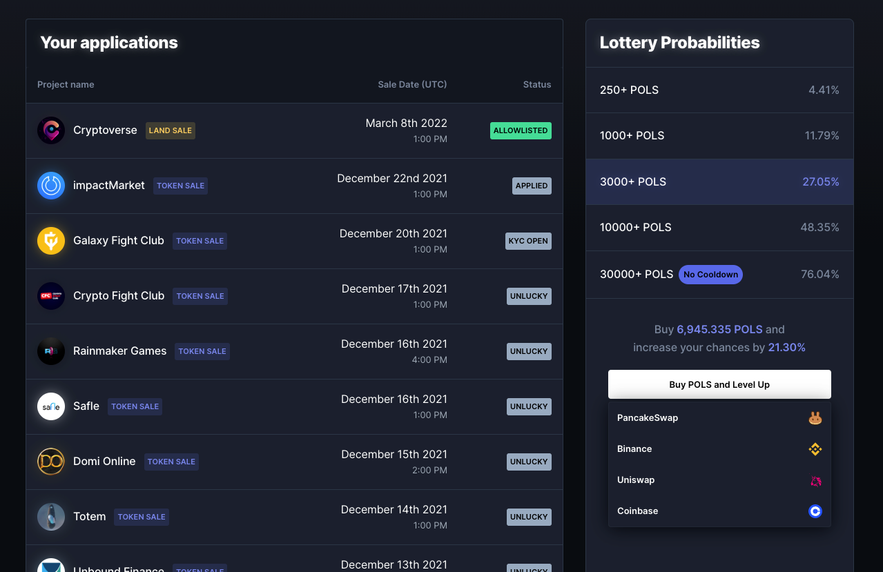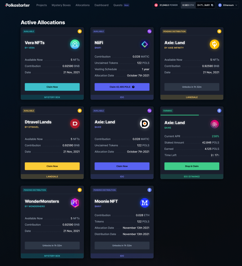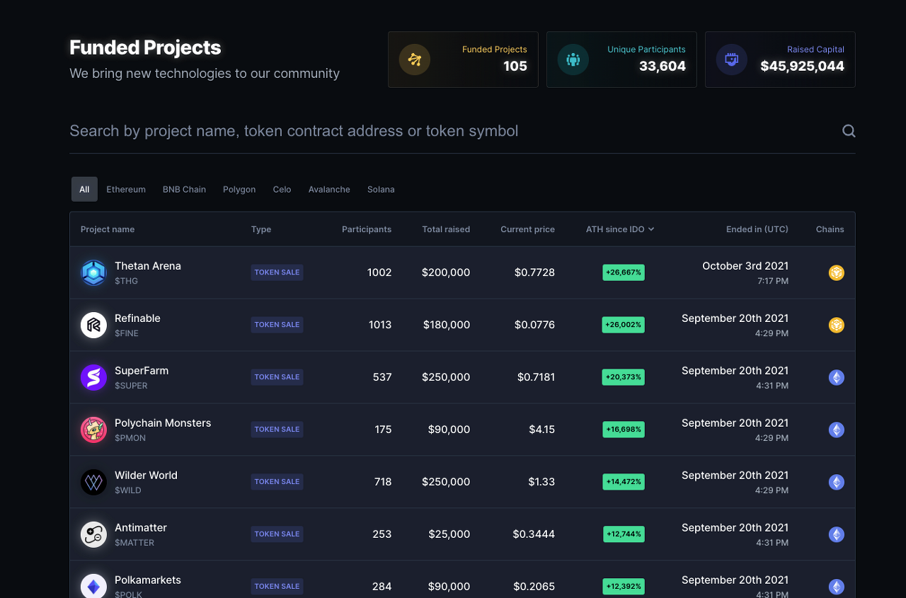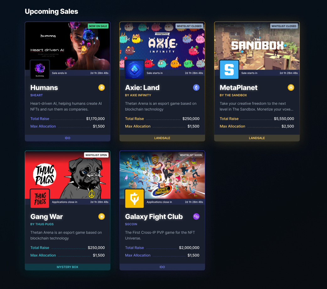 이제 홈페이지와 프로젝트 페이지에서 프로젝트를 볼 때 프로젝트 카드 아래쪽 색깔이 코딩된 판매 타입 (IDO, LAND SALE, 등)을 나타내는 새로운 레이아웃을 발견할 수 있습니다.