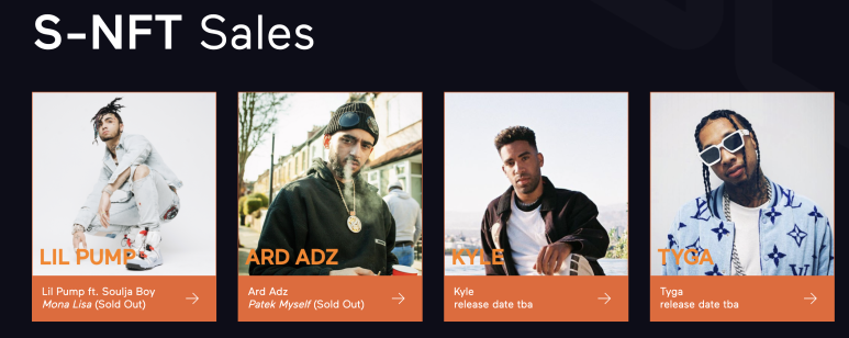 LINE과 협력중인 음악 저작권 NFT 런치패드 프로젝트로 작년 후오비에 상장하여 100배의 상승률을 보여줬습니다. 현재까지 2개의 S-NFT를 런칭하여 완판을 이뤄냈고 Kyle, Tyga의 NFT가 발매 예정입니다.