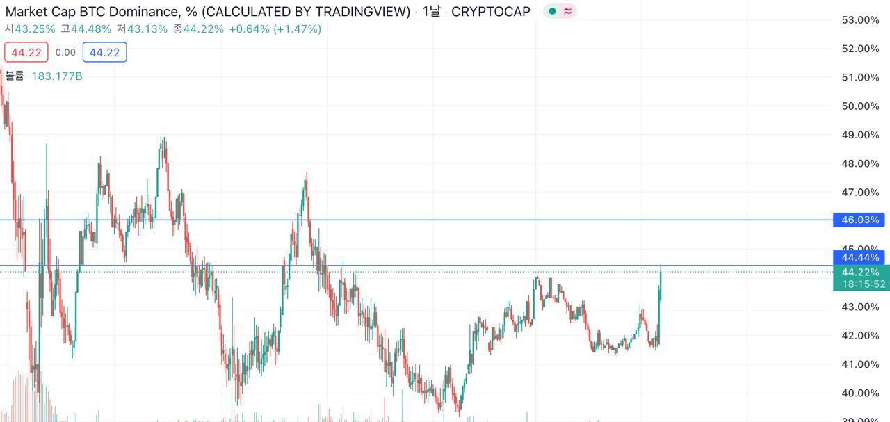 44.44구간은 개인적으로 지켜줬으면하는 구간이고 손익비가 좋은 구간이라고 생각됩니다.