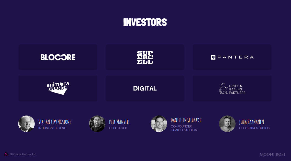 Moonfrost는 Blocore, Pantera, Animoca Brands, Giffin Gaming Partners 등 크립토와 기성 게이밍 업계의 빅네임들로부터 $4.5M을 성공적으로 모금했습니다. 엔젤 투자자로는 UK Game Startups의 Ian Livingstone경, Nonstop Games의 사업가 Phil Mansell, Soba Studios의 CEO Juha Paananen, Famico Studios CEO Daniel Engelhardt, Aggero의 CEO Christian Manea 등이 있습니다.