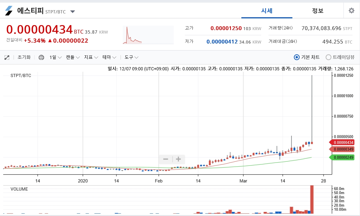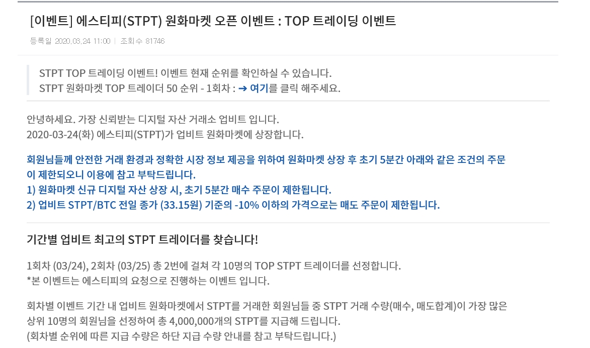 암호화폐 밀크 외에 최근 원화 마켓 상장이 뜸했던 업비트가 금일 오전 11시 기습적인 STPT 원화 마켓 상장이 있었습니다.
