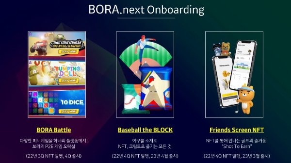 โ์นด์นด์ค๊ฒ์์ฆ์ ์์ฌ ๋ธ๋ก์ฒด์ธ BORA ํ๋ซํผ์ 'ํ๋ ์ฆ ์คํฌ๋ฆฐ NFT', '๋ณด๋ผ ๋ฐฐํ', '๋ฒ ์ด์ค๋ณผ ๋ ๋ธ๋ก' ๋ฑ์ ํ๋ก์ ํธ๋ฅผ ๊ณต๊ฐํ์ต๋๋ค.