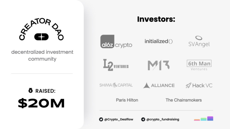 โCreatorDAO์ ์๋ ํ๋ฉ ๋ผ์ด๋์๋ 16z, Initialized Capital, 2 Ventures, M13, Audacious Ventures, 6th Man Ventures, Abstract Ventures, SV Angel, Hack VC, Fika Ventures, Fuel Capital, Goldhouse, Soma Capital, Alliance DAO, Shima Capital, Olive Capital, Kygo's Palm Tree Crew, MGU๊ฐ ์ฐธ์ฌํ์ต๋๋ค.