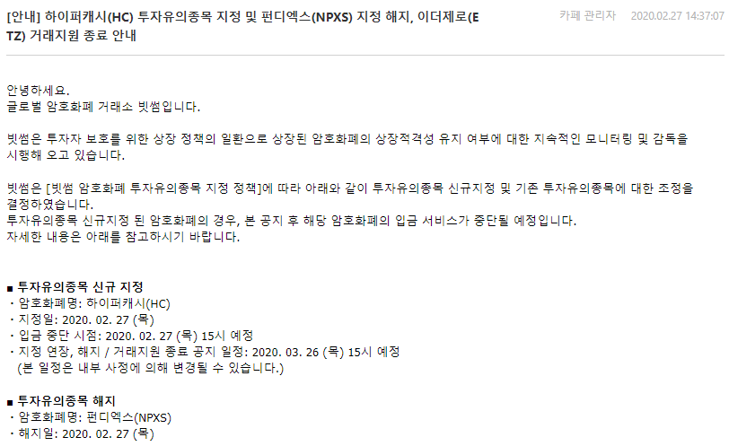 얼핏 보면 같은 투자유의지정이라고 볼 수 있지만 빗썸 거래소는 2020년 2월 27일 투자유의종목 관련 공지를 통해 투자유의종목에 대해 입금 서비스 중단을 예고했습니다.