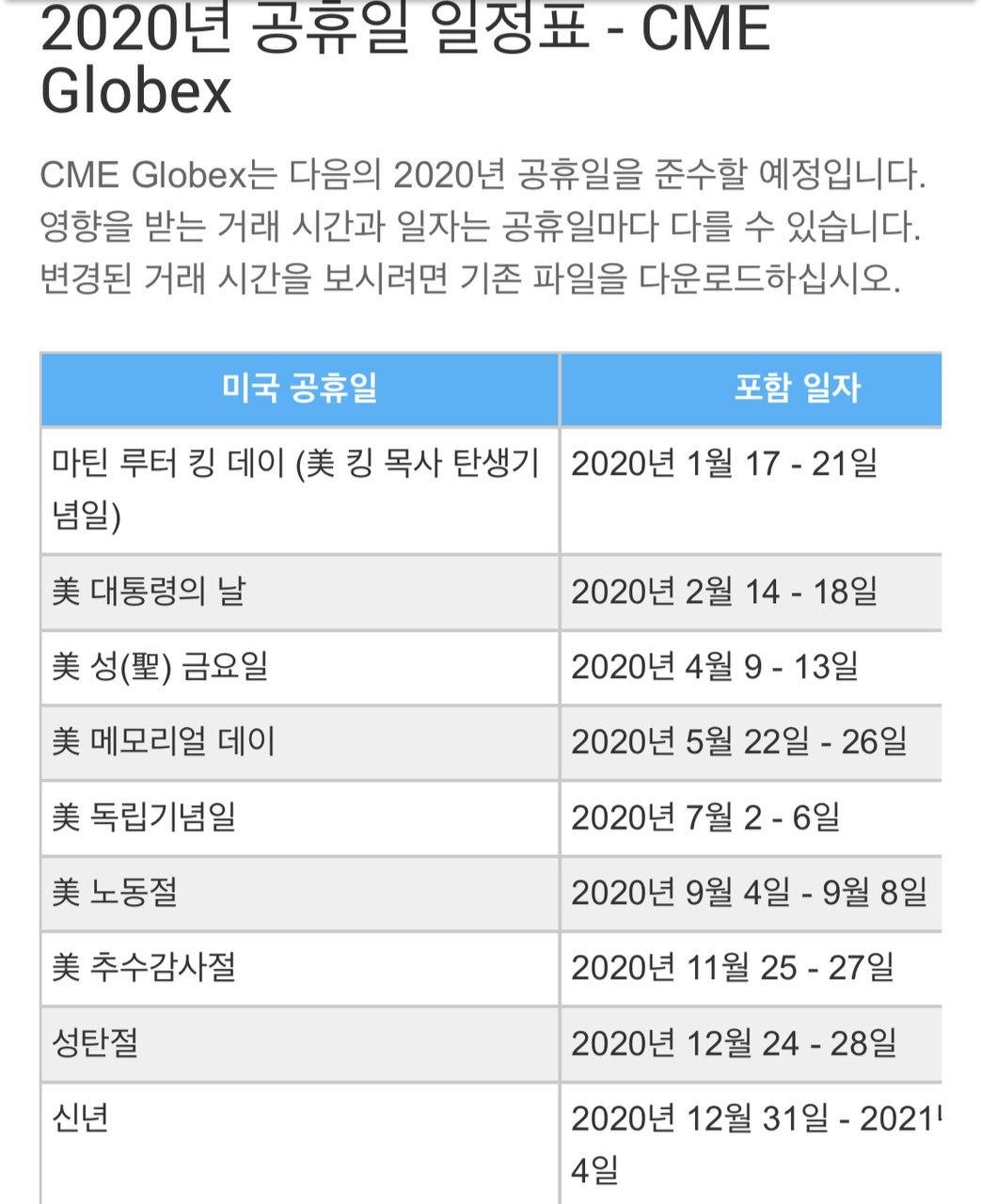 2020년 CME그룹 휴장 일정표 입니다. 확인시면 좋을 듯 하네요.