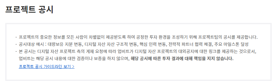 프로젝트 공시는 프로젝트의 중요한 정보를 거래소를 이용하는 모든 투자자들이 제공받을 수 있도록 해주는 좋은 의도에서 시작되었습니다.