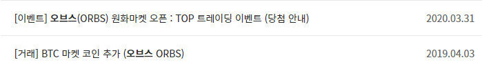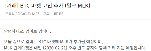 * 밀크 코인의 경우 BTC마켓 상장과 동시에 원화 마켓 오픈 예고를 공지에 등록하였습니다.