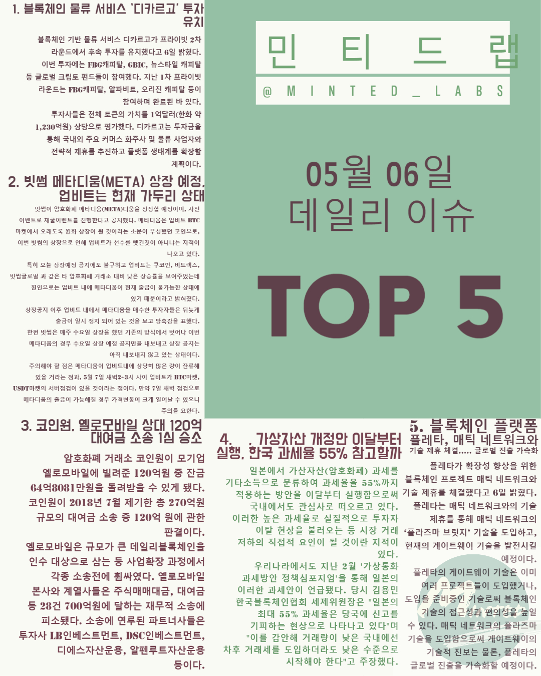 암호화페 투자자 여러분들께 보다 양질의 정보제공을 위해 노력하는 민티드랩이 되겠습니다. 많은 관심과 격려 부탁드립니다.^^