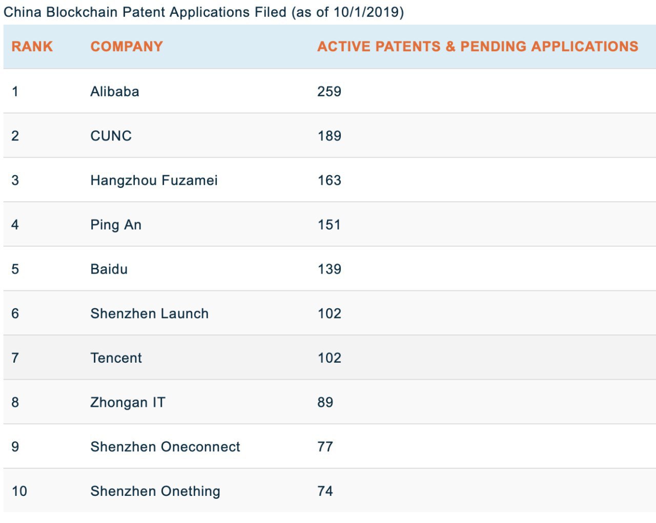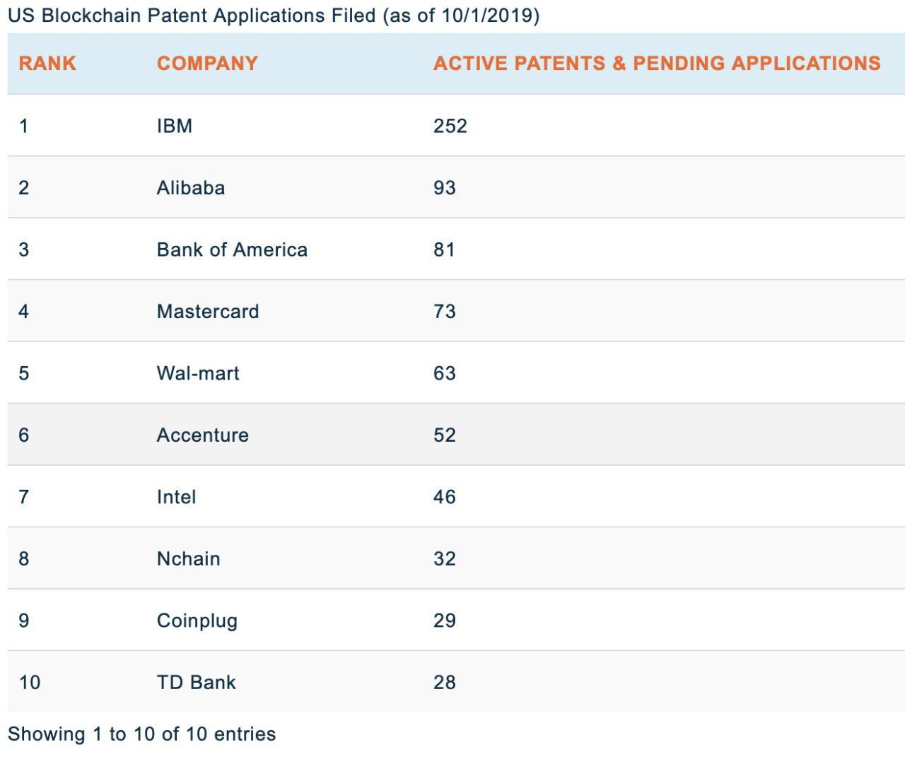블록체인 특허의 최상위 회사에서 블록 체인 특허 분포도를 조사한 표입니다.