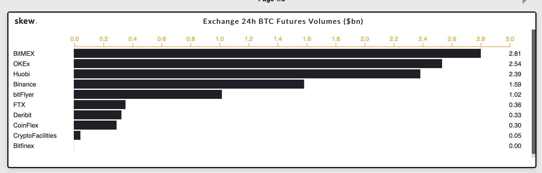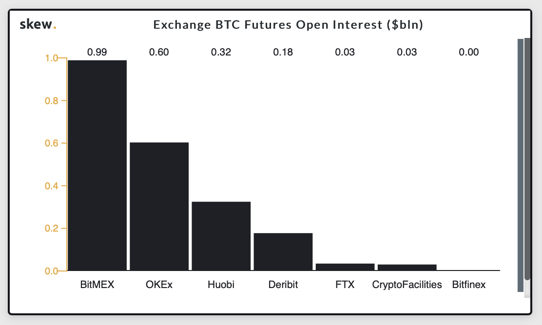 아래 skew.com 분석 사이트의 BTC 선물 볼륨을 보면 현재 비트 맥스, 오켁스, 후오비, 바이낸스 순으로 선물 볼륨이 상승한 것을 확인할 수 있습니다. 갑작스럽게 상승한 OKEX의 선물 거래량, OKex의 행보 지켜봐야 할 것 같습니다.