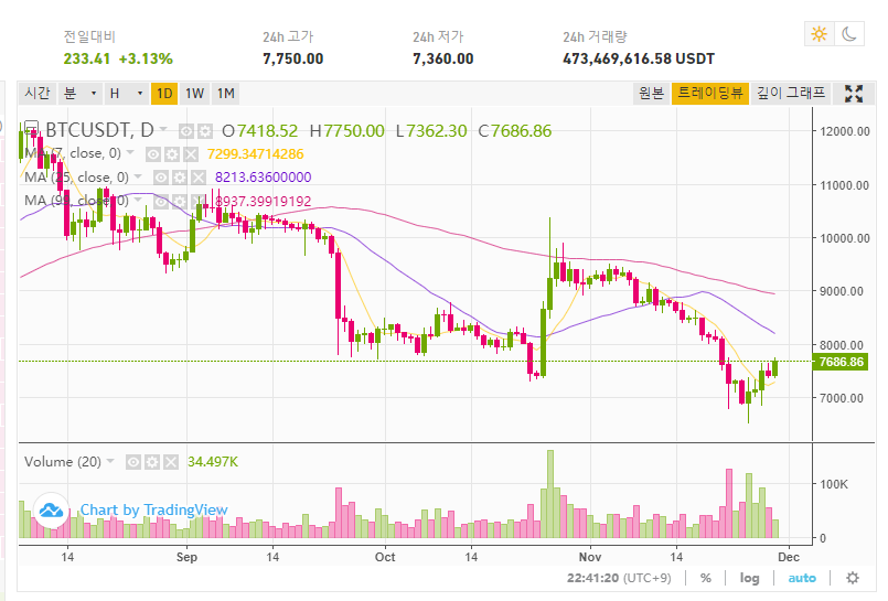 금일 비트는 최저점 7362를 찍고 전달 대비 소폭 상승한 모양으로 거래 중이며. 8K 부근 저항이 조금 있을 수 있으며