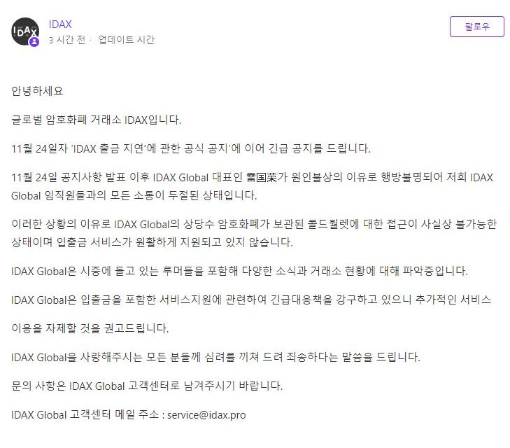 금일 IDAX는 위와 같은 공문을 올리면서 IDAX의 대표 잠적 사실을 털어놓았습니다.
