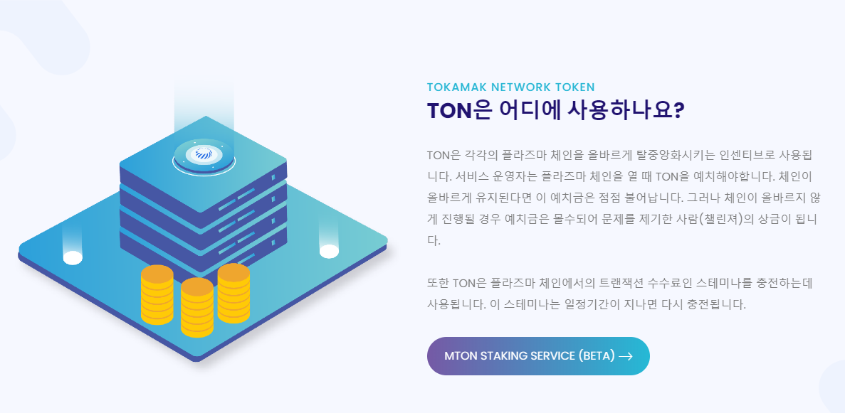토카막 네트워킄 스테이킹 서비스를 운영중이며 스테이킹 방법은 자체 토큰 TON 을 블록체인상에 위임을 하고 위임한 TON 의 경우 블록체인상 검증 용도로 사용 합니다. 이 에 따른 보상으로 TON을 지급 하며 위임한 수량에 비례해 매년 19% 에 해당하는 TON을 받을수 있습니다.