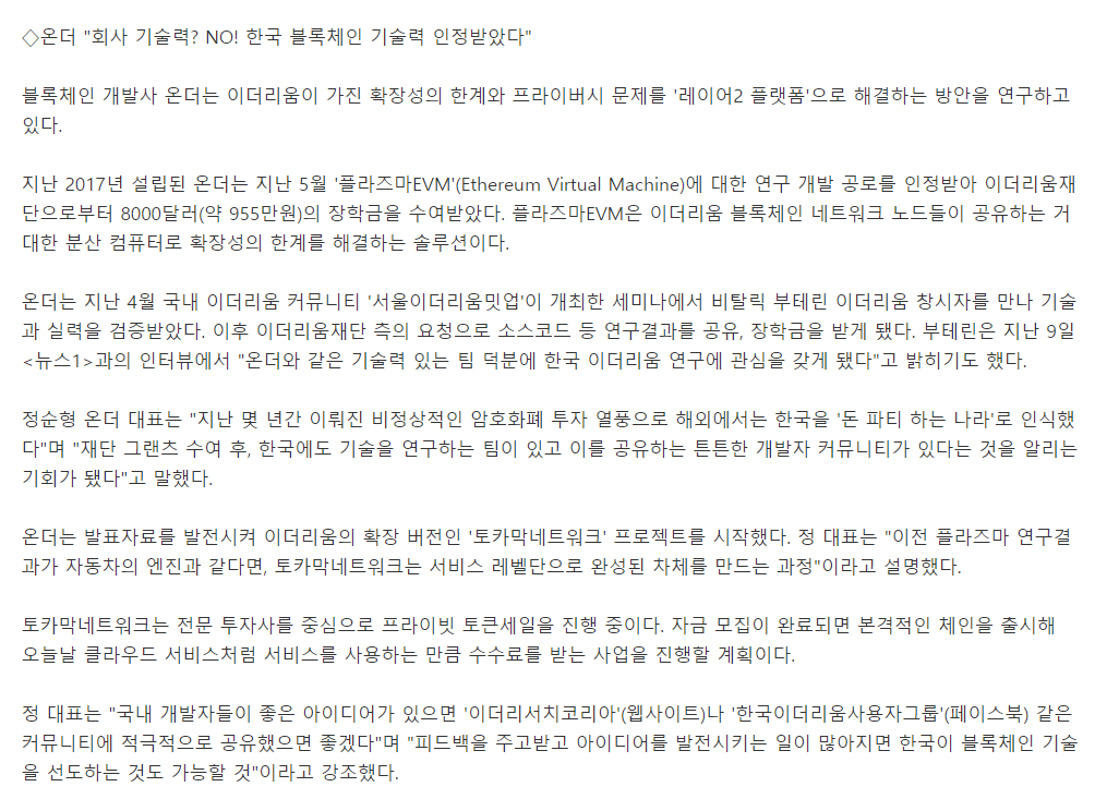 정순형 CEO 가 운영하는 온더 는 2018년 한화 시스템과 블록체인 분야 부분에서 업무 협약을 맺었으며 특히 CEO 로 있는 정순형 은 학창시절 블록체인 기술에 관심이 많았으며 채굴 했던 경험을 바탕으로 소프트웨어 특허와 이에 대한 기술 논물을 발표하는 등 블록체인 분야에 굉장한 관심을 보였습니다. 이후 온더를 설립 하여 이더리움 서비스를 개발 및 컨설팅 을 하고 있습니다.