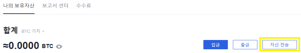 [자산관리] -> [나의 자산]에 들어간 후 우측의 [자산 전송]에서 펀딩 계정에 보유한 자산을 마켓에서 거래하기 위해 스폿 계정으로 옮깁니다.