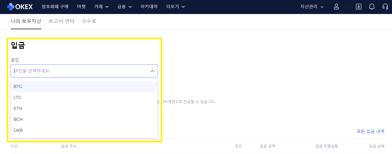 1. OKEx 거래소 공식 홈페이지 접속 후 우측의 [자산관리] -> [입금] 탭에 들어갑니다.