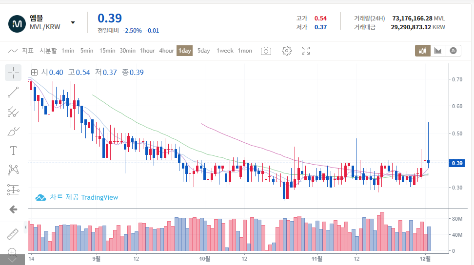해당 기사가 나간 뒤 후오비 코리아에서는 최고가 0.54를 기록하였으며 지금은 0.39 원에 거래 중입니다.