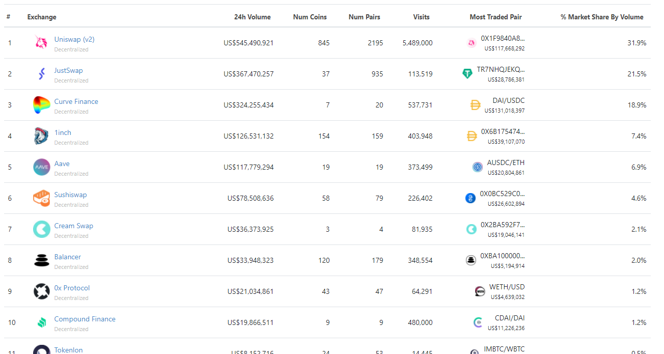 DEX 거래소는 상당히 많습니다. 바이낸스 DEX 부터 IDEX , allbit 등 몇몇 DEX거래소가 있었으나 기존 거래소에 비해 거래량이 거의 없어서 어떠한 코인을 사기 위해서 상당히 힘들었습니다. 그러나 유니 스왑의 경우 기존 DEX 거래소 를 비웃기라도 하듯이 상당한 거래량을 보여주고 있으며 거래가능한 코인의 개수 또한 845개로 굉장히 많은 코인을 거래가 가능합니다.