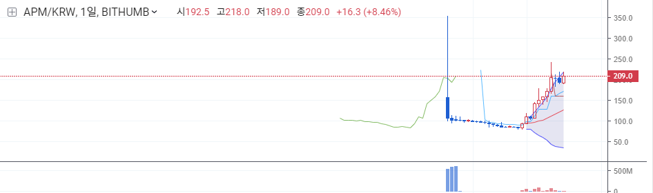 빗썸 거래소에 상장된 apM은 상장 직후 고점 355원을 기록한 뒤 지속적으로 하락하는 모습을 보이다가 최근 꾸준한 상승 흐름으로 인해 현재 약 210원 정도에 위치해있습니다.
