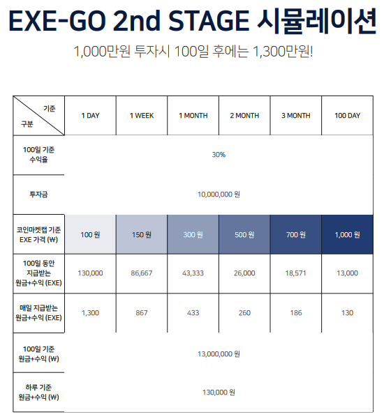 EXE-GO는 EXE Protocol에서 출시한 투자 상품으로 이전에 진행했던 EXE-GO 1st STAGE(기관 투자자 대상)에서는 최저 30%, 최고 115%의 수익을 발생시킴으로써 성공적으로 마무리되었습니다.