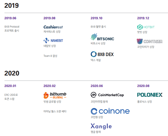 EXE Protocol은 2019년 6월 프로젝트 출시를 시작으로 8X8 월렛 출시, 마이닝 웜스 오픈 베타, 다양한 거래소들에 상장을 진행했으며 최근에는 bananaex, Bittrex, OKEX 등에 추가 상장되었습니다.