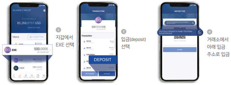 AllianceX Wallet을 설치했다면 가입 후 지갑에 EXE 주소로 거래소에서 1,000만 원 이상의 EXE 수량을 입금하여야 합니다.