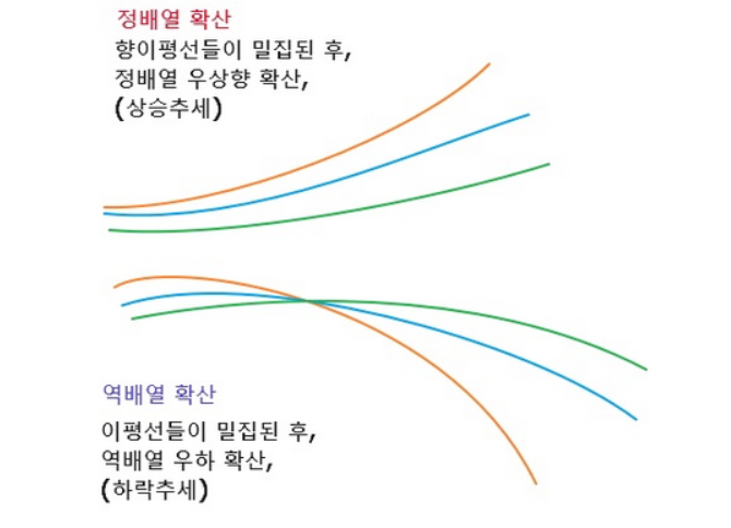 역배열 확산에서는 밀집된 구간에서 밑으로 하락하는데 대부분이 단기 이동평균선이 중기,장기 이동평균선을 순차적으로 데드크로스 하는것이 특징입니다.
