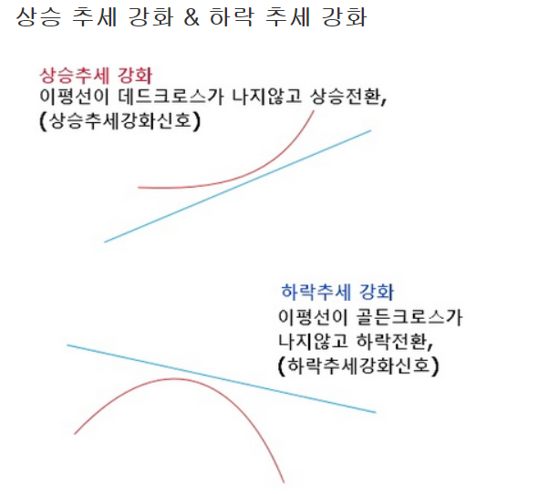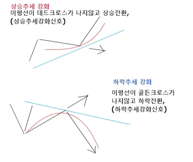 위 그림 중 상단 그림은 단기 이평선이 장기 이평선을 뚫고 데드크로스로 나가는 그림에서 상승전화 되는 그림입니다.이는 상승추세 강화 신호로 봅니다.'강화'입니다.앞전부터 이어온 상승장에 더 힘이 강해진다는 뜻이죠.