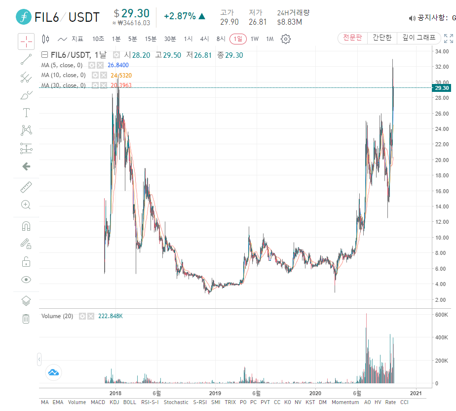 현재 파일 코인의 경우 2017년 ICO 이후 GATE.IO 에서 전고점을 탈환하기 직전입니다.
