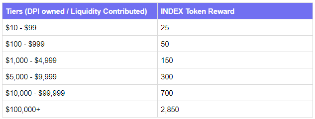 유동성 채굴 프로그램의 경우 전체 INDEX 토큰의 9%인 900,000 INDEX 가 이 프로그램에 할당되었으며 2020년 10월 7일부터 60일 동안 DPI/ETH 유동성 공급자에게 배포된다고 합니다.
