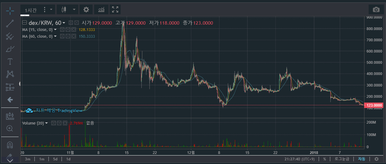 덱스는 상장 약 1개월 뒤 고점인 860원에 도달합니다. 이것은 사전 채굴가의 172배이며 초기에 많은 거래가 이루어졌던 60~80원 구간 대비로도 10배 이상 크게 상승한 가격입니다.