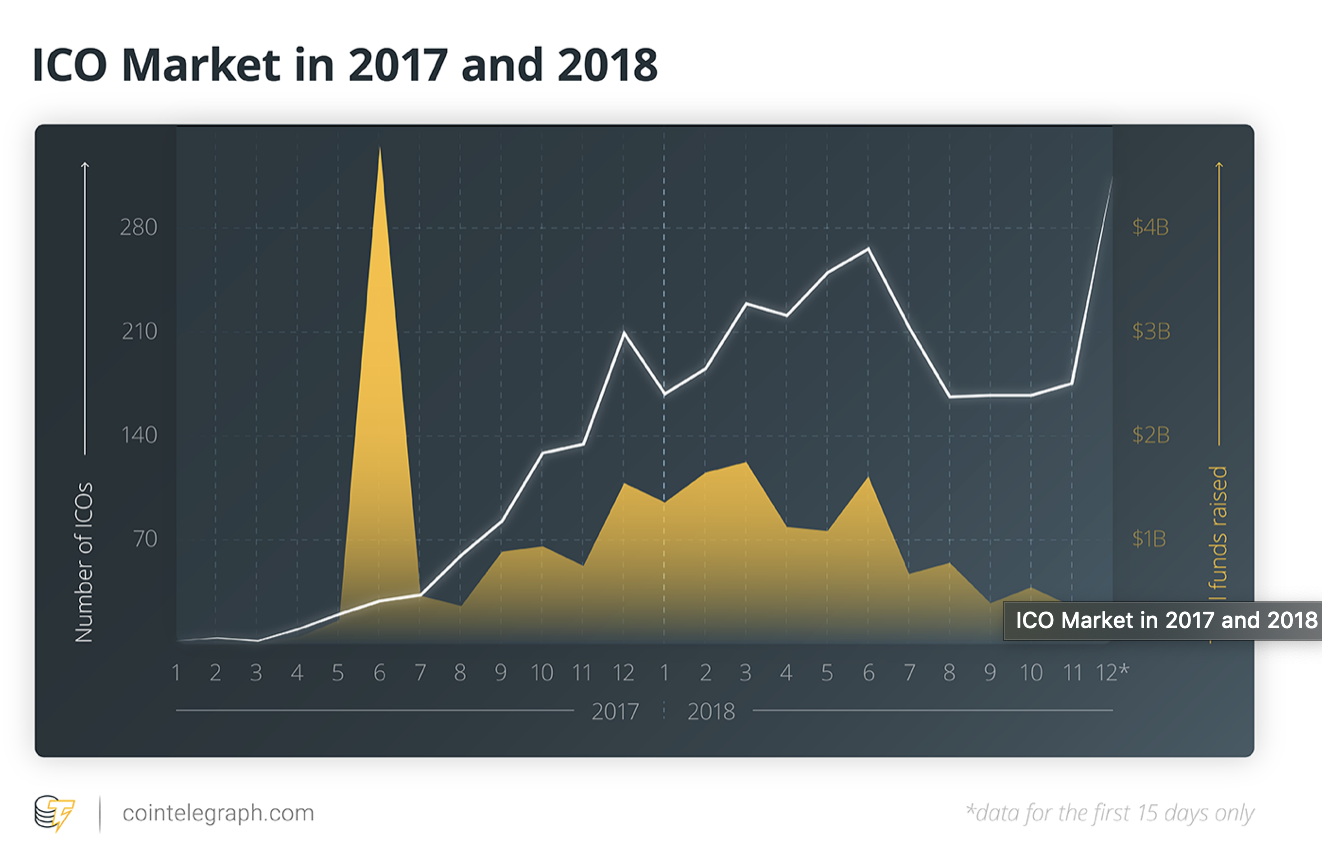 확실히 아래 그래프로 확인해본다면 2017년도의 ICO성공을 눈으로 본 사람들이 2018년 초까지는 많이 투자하였습니다.