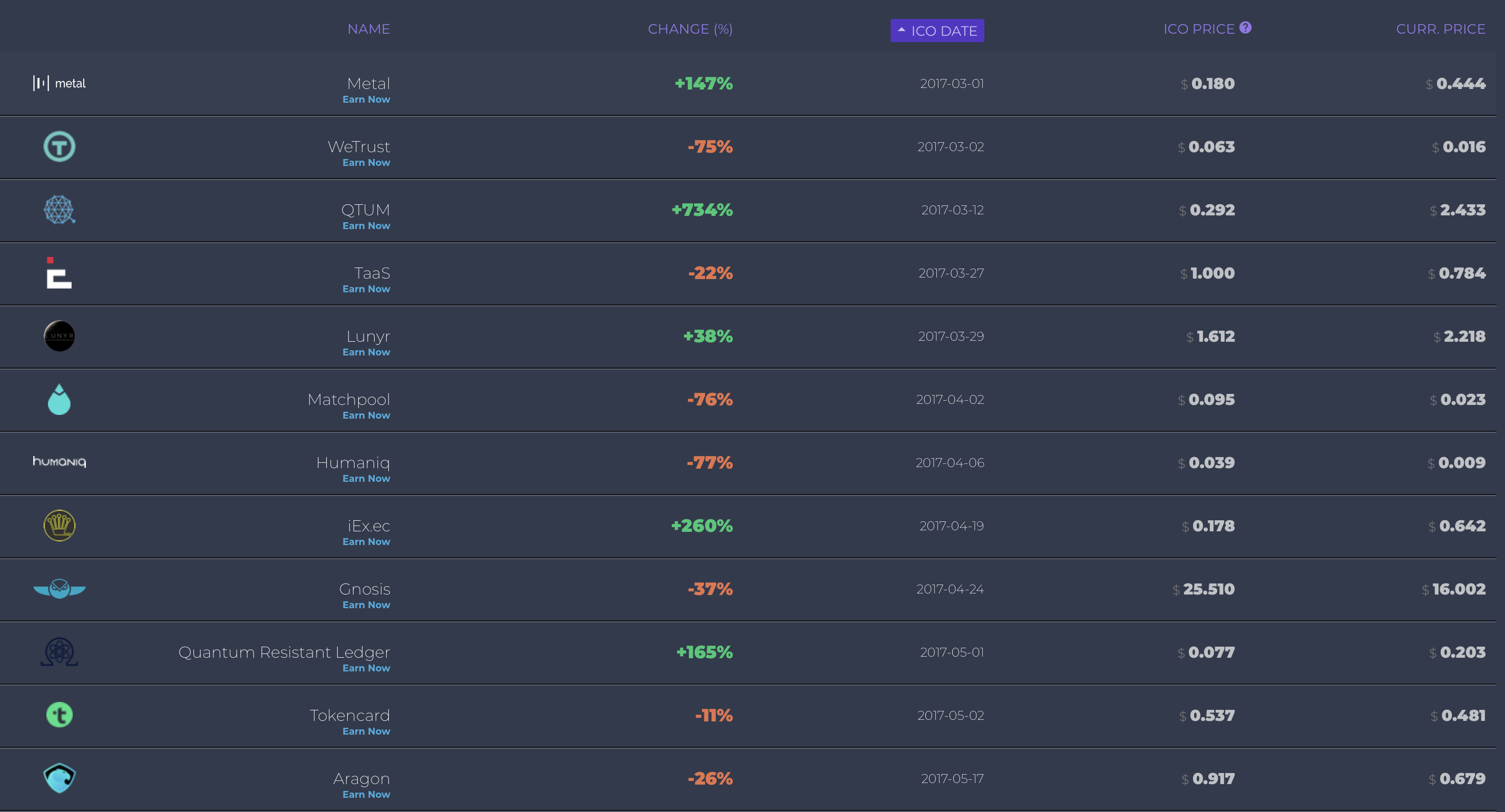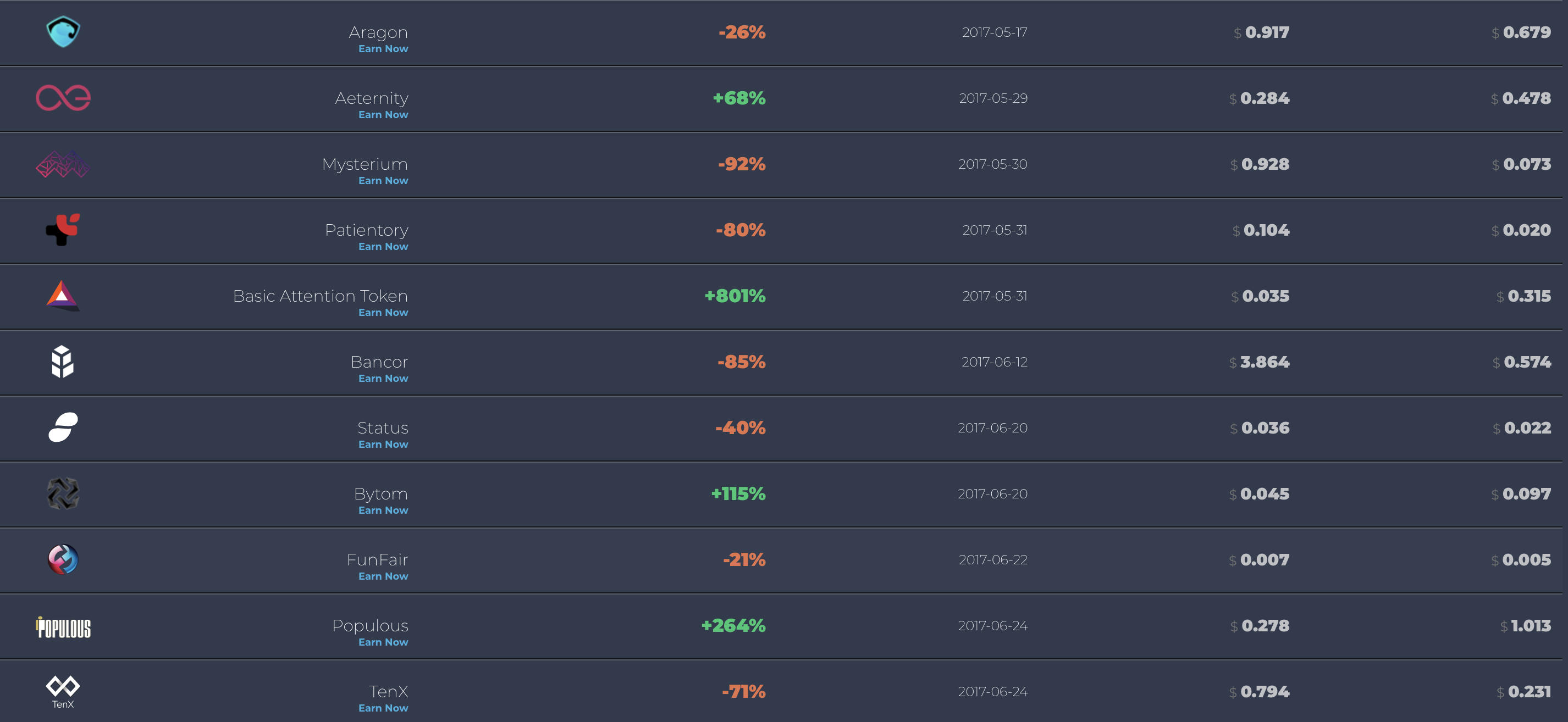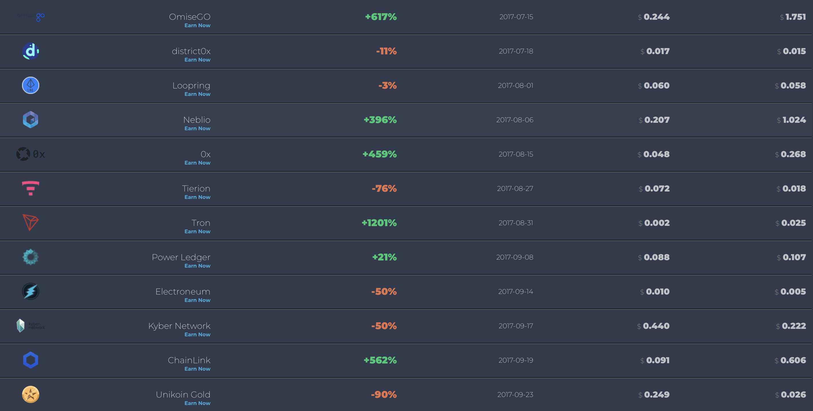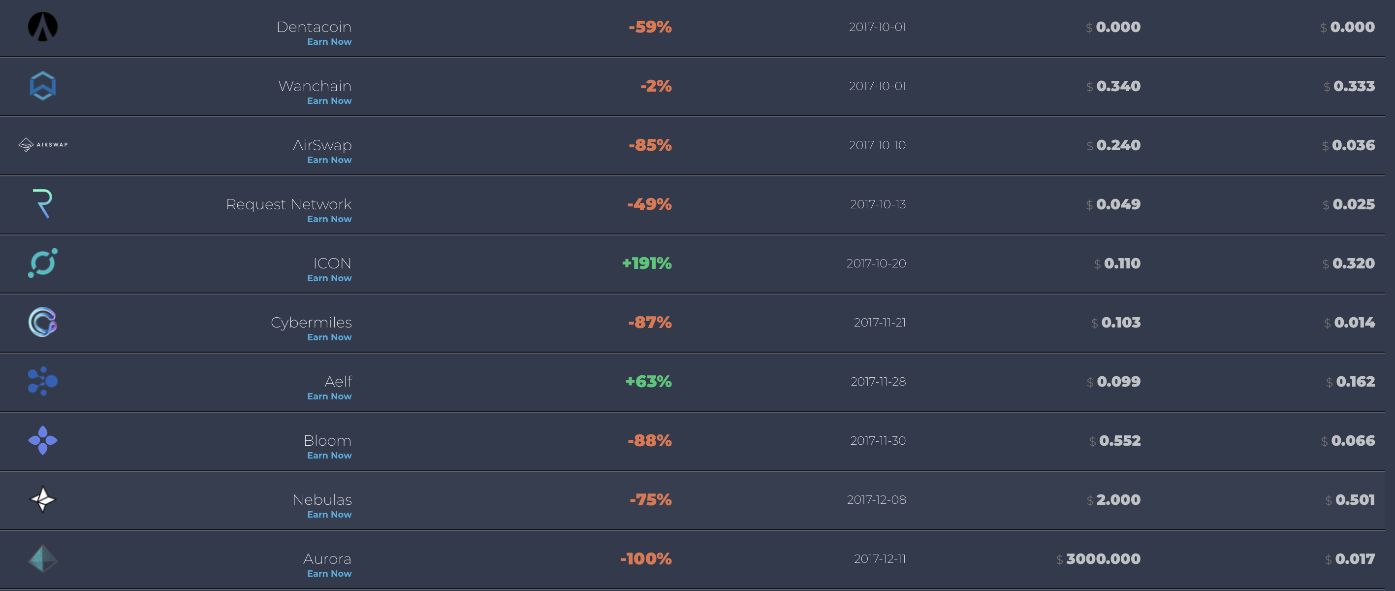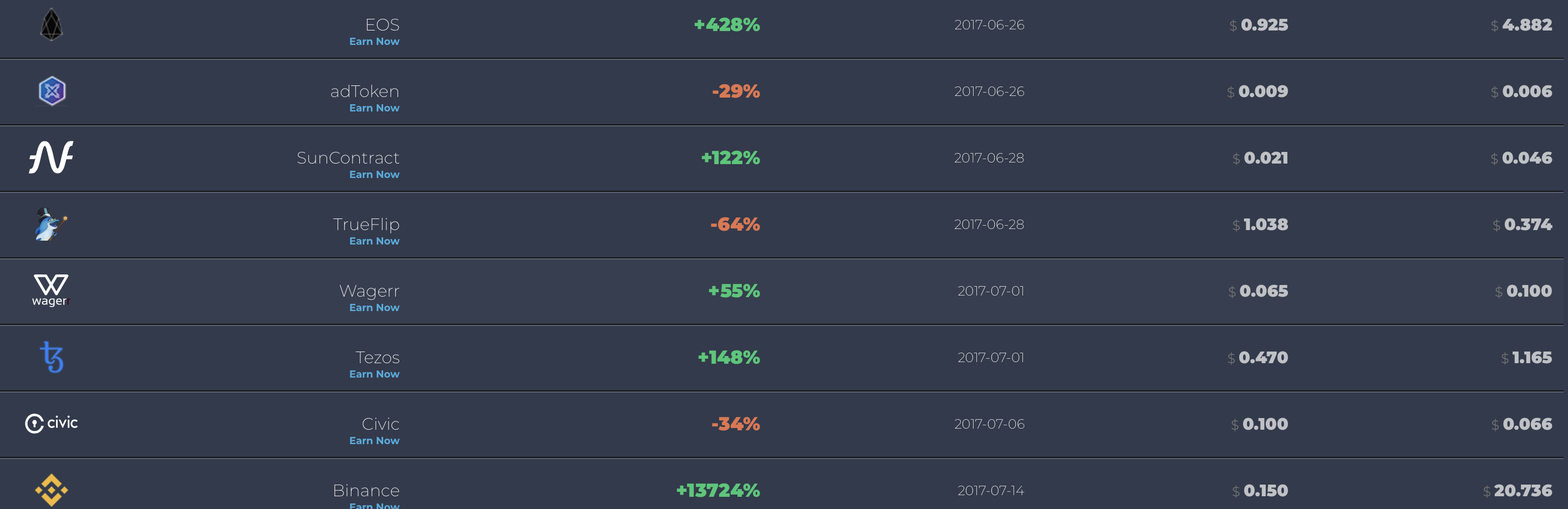17년도 수없이 나온 ICO 들은 비트코인의 폭발적인 상승에 편승하여 작게는 5배 크게는 아이콘과 같이 100배에 이르는 수익률을 달성하게 되었습니다.