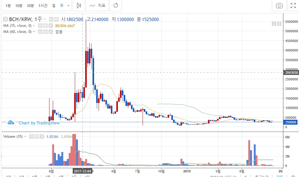 당시 30만 원에서 240만 원까지 단기간에 치솟은 비트코인 캐시의 모습을 볼 수 있습니다. 240만 원까지 올라간 날 빗썸의 서버가 다운되며 수많은 피해자들이 양성되었다고 하나... 그로부터 한 달 뒤 비트코인 캐시는 240만 원의 두배가 넘는 550만 원대까지 올라가게 됩니다. 수많은 투자자들이 존버 할걸. 버틸걸. 손절하지 말걸... 외치던 시기였습니다.