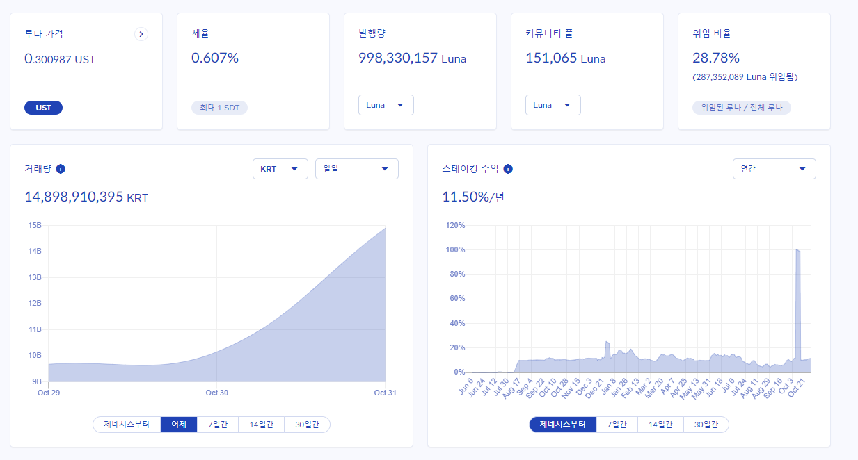 테라의 수요(결제율)가 높아질수록 테라에서 발생하는 수수료를 루나 코인을 스테이킹한 홀더들에게 돌아가고 있습니다.