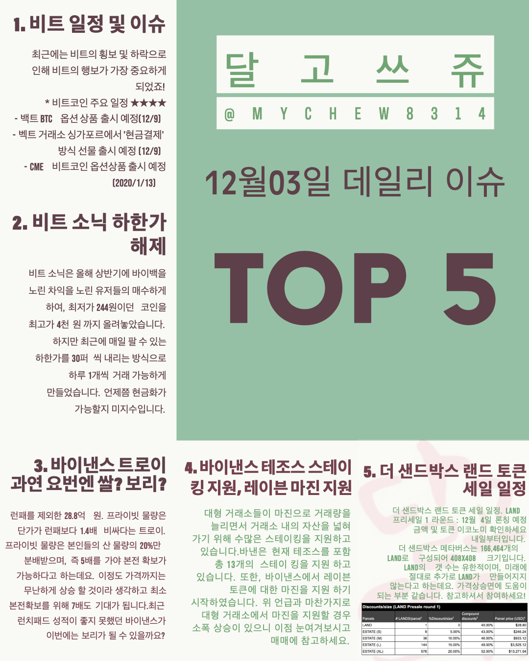 더 샌드박스 랜드 토큰 세일 일정. LAND 프리세일 1 라운드 : 12월 4일 론칭 예정 금액 및 토큰 이코노미 확인하세요 내일부터입니다.