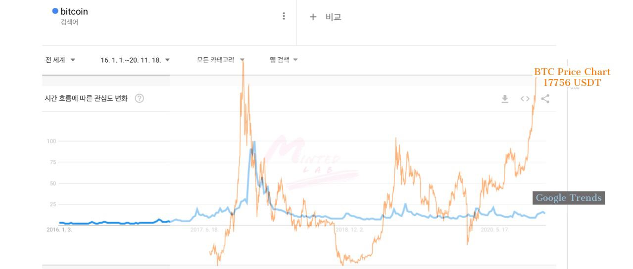 실제로 구글 트랜드로 볼경우 2017년과 비교하여 상당히 낮은 관심도에도 불구하고 비트코인의 가격은 고점을 갱신을 하였습니다.