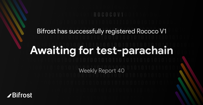 본 포스팅은 < 원본 : Bifrost has successfully registered Rococo V1, awaiting for test-parachain, Weekly Report 40 >의 번역본으로 Bifrost 바이프로스트 프로젝트에 관심이 있는 커뮤니티 투자자분들의 편의를 위해 작성되었습니다.