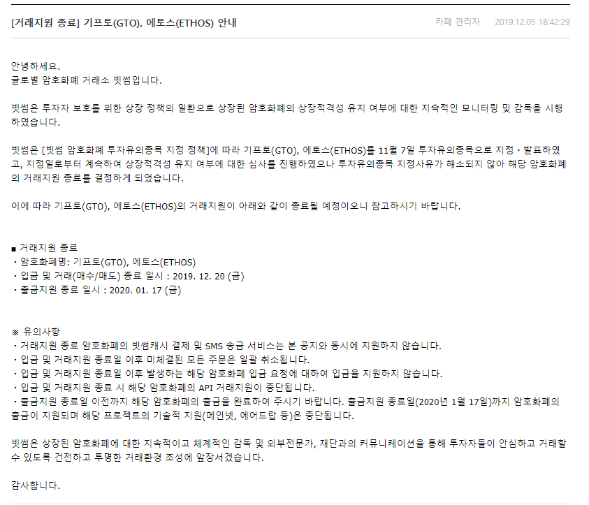 금일 빗썸은 기프토와 에토의 거래를 종료하였습니다. 최근 빗썸은 원활한 자금 순환이 이유인지 상장과 상장폐지를 반복하고 있습니다. 투자 유의 종목을 지정하여 빗썸에서 방출하는 한편 새로운 순환 자금을 위한 것인지 상장 또한 지속적으로 하는 중입니다. 해당 종목들은 빗썸이 일전에 투자 유의 종목을 지정하였으며 공지 사항에 나와 있듯 투자 유의 종목 지정 사유가 해제되지 않아 해당 토큰을 상폐하기로 한다고 쓰여있습니다. 2개의 토큰을 전일보다 10 - 7 % 수준의 하락을 하였습니다.