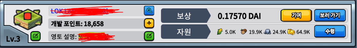 3 레벨 짜리 랜드에서 발생하는 DAI와 자원이며 이렇게 발생한 자원은 언제든 수령이 가능합니다. 현재 총 4개의 대륙에서 발생한 자원이기 때문에 대륙이 많아지면 많아질수록 보상받는 자원은 증가하게 됩니다.